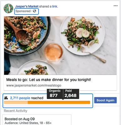 Facebook posts work like a newsletter platform. Everytime you post people who have liked or followed your Page can see the post. This is true for both your Facebook business Page and your Instagram account. People may like, comment or share this content if they wish. This type of reach is called organic, which is another way to say that it's free. You create a post and it spreads organically, from people who engage with your content to their friends and so on. This process is an important part of increasing your number of Page followers, but it may not grow your audience as quickly as you'd like.