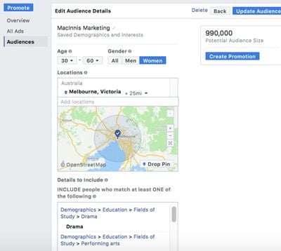 Audience - one of the best features of Facebook and Instragram advertising is the targeted you can do based on many demographics. It allows you to pinpoint your most likely buyers for conversion. Make sure when you are buildng your ad you spend some time in identifying the best audience by choosing from the options listed.